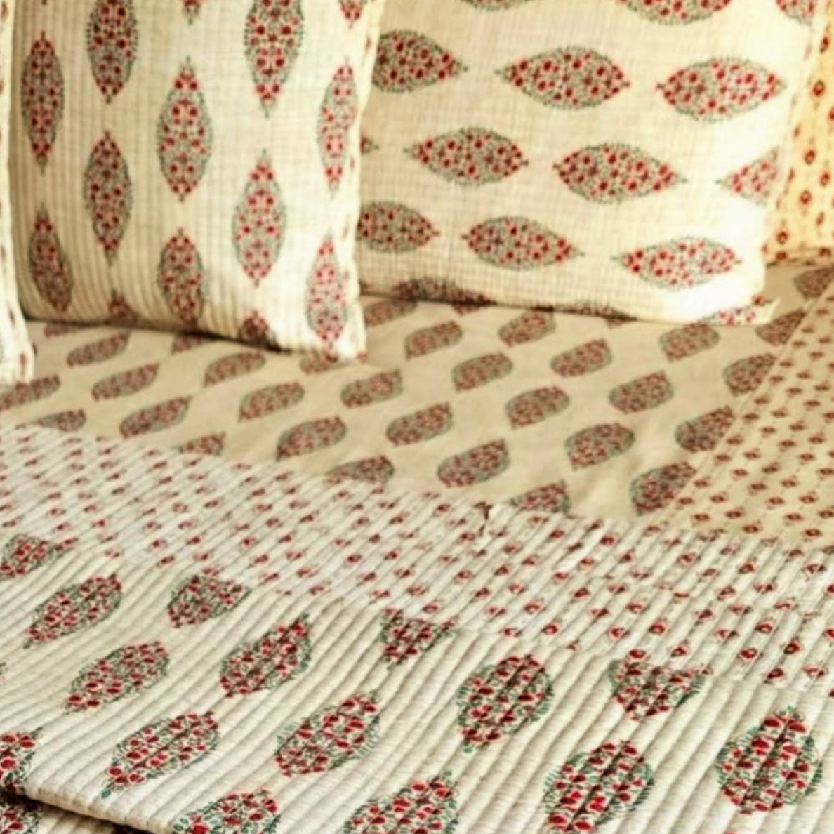 Wrap yourself in timeless elegance with Gulistan Serenity, where hand-block artistry blooms across soft, breathable cotton. The delicate leaf-shaped motifs in ruby red and sage green echo the charm of Mughal gardens - orderly yet alive with nature’s poetry. Paired with matching cushions, this quilt transforms your space into a serene haven of warmth and heritage.