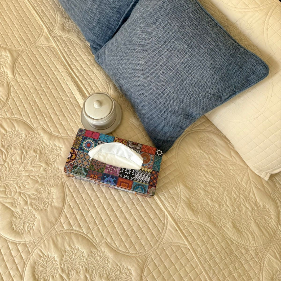 Light yet luxuriously layered, it is perfectly suited for the UAE climate—breathable for summer nights, cozy for cooler evenings. Paired with calming blue cushions, it brings a serene, understated charm to your bedroom, a space where comfort and style blend seamlessly.