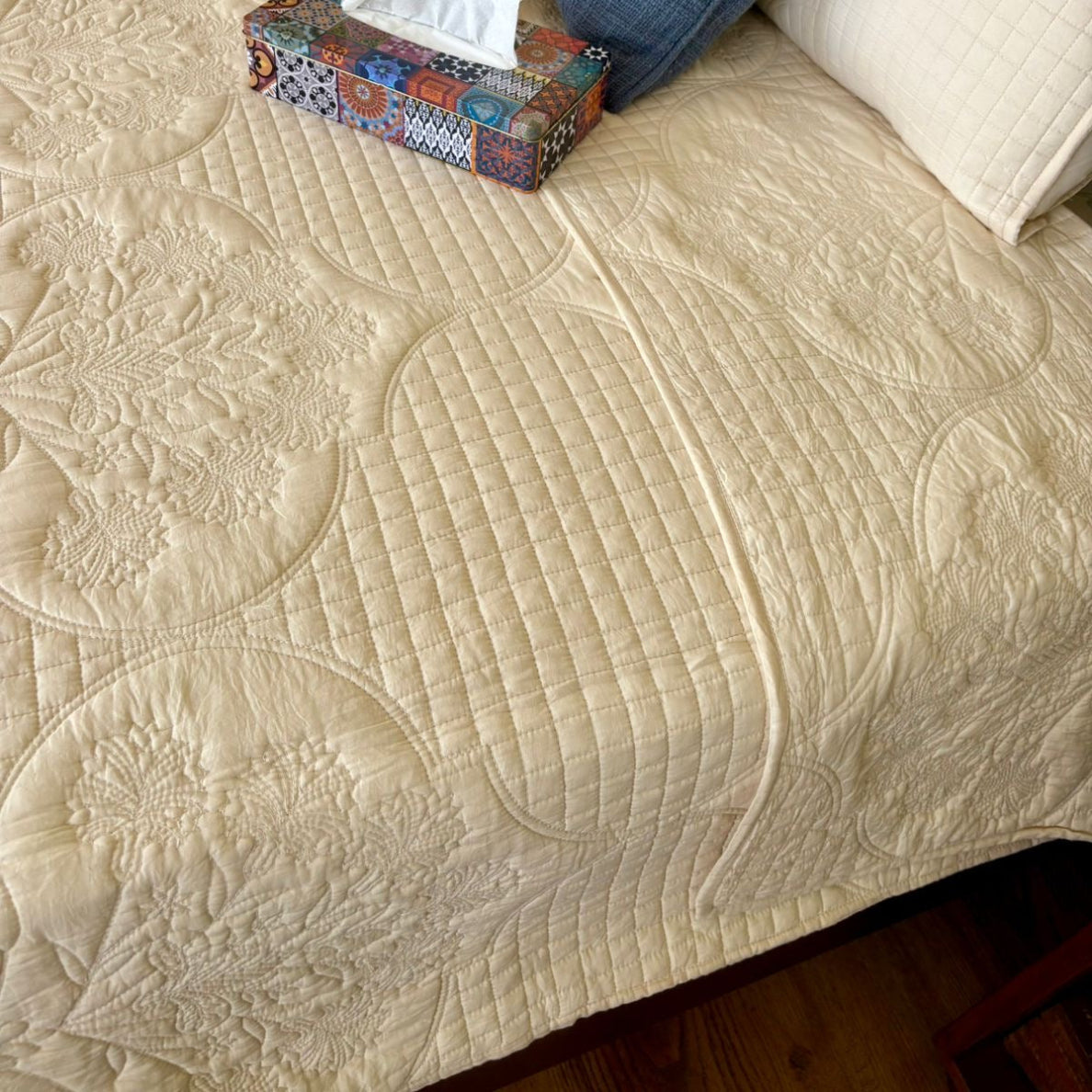 Featuring a soft cream base and intricate stitched florals, this quilt carries an air of timeless sophistication.